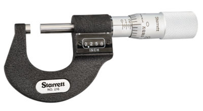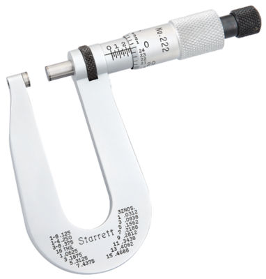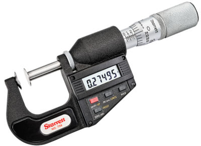 The starrett 764 series lcd outside micrometer has a deep throated frame for measuring thickness of sheet metal paper plastic or rubber parts a single value lcd readout that displays in inch and metric units with resolution to 0 00005 0 001mm for outside diameter od measurement and a vernier scale in inch units for taking precise outside diameter od measurements.